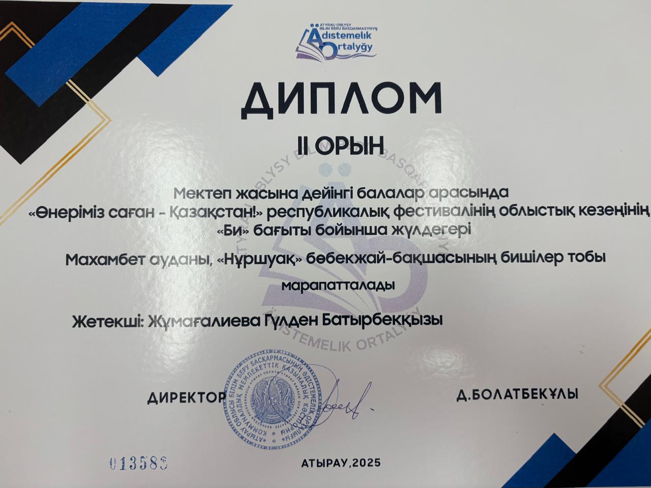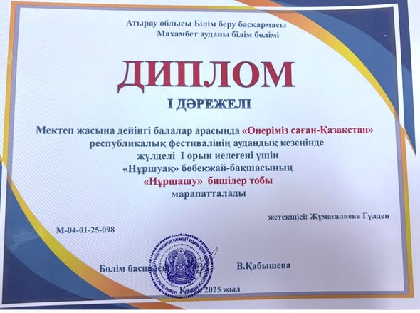 дәрежелі Дипломмен марапатталды, жетекшісі би маманы Жұмағалиева Гүлден