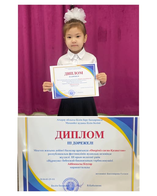 "Нұршуақ" бөбекжай- бақшасының тәрбиеленушісі Айбекқызы Кәусар және жетекшісі Бектемирова Гулзада III дәрежелі Дипломмен марапатталды.